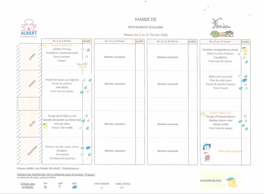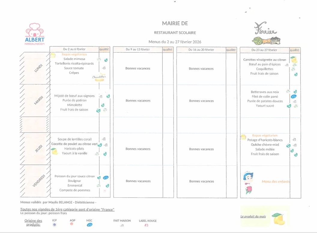 Menus des restaurants scolaires du 02/02 au 27/02/2026
